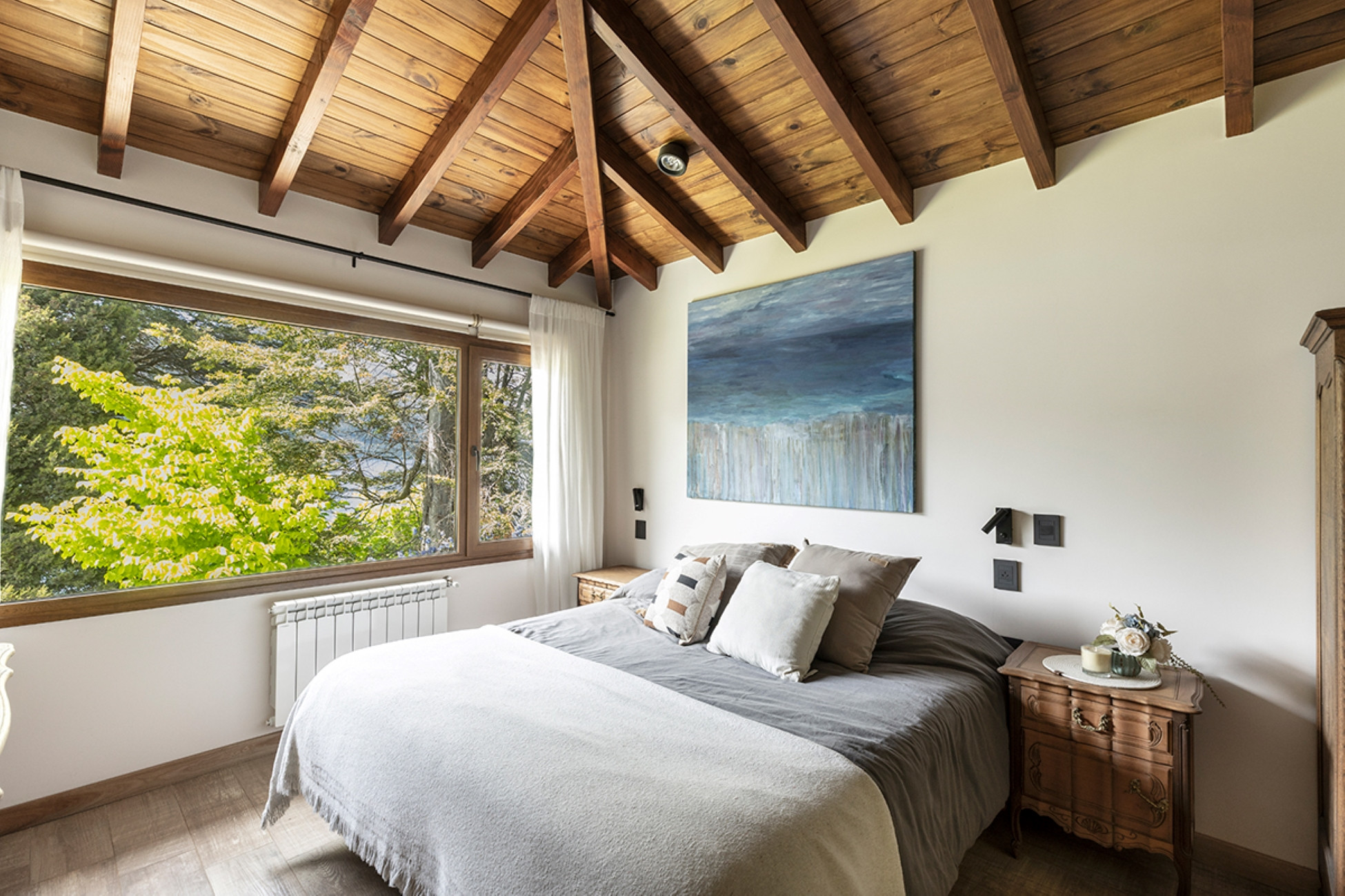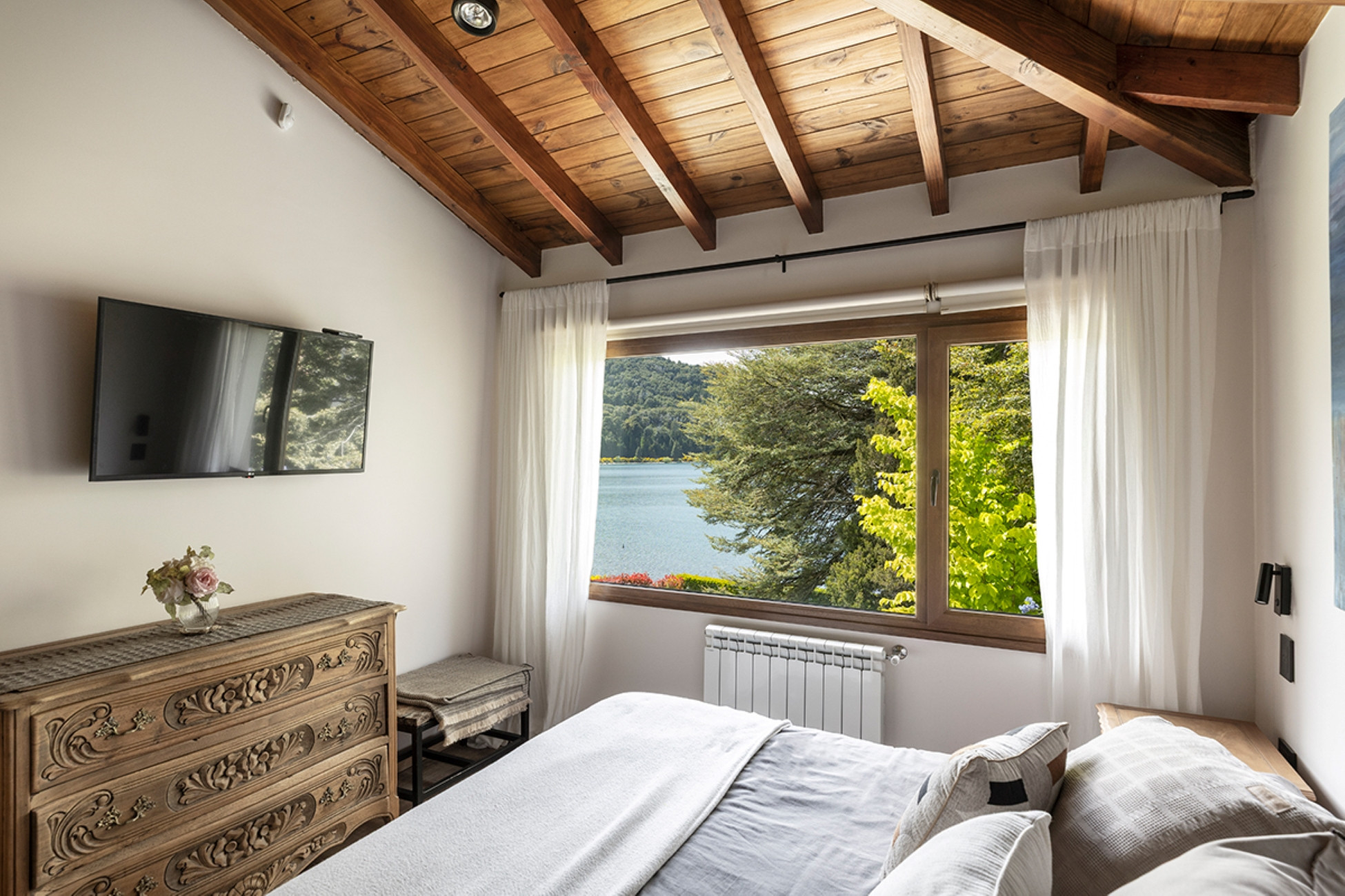 O aquecimento é por piso radiante (automático), Todos os quartos têm vista para o lago e cortinas blackout.