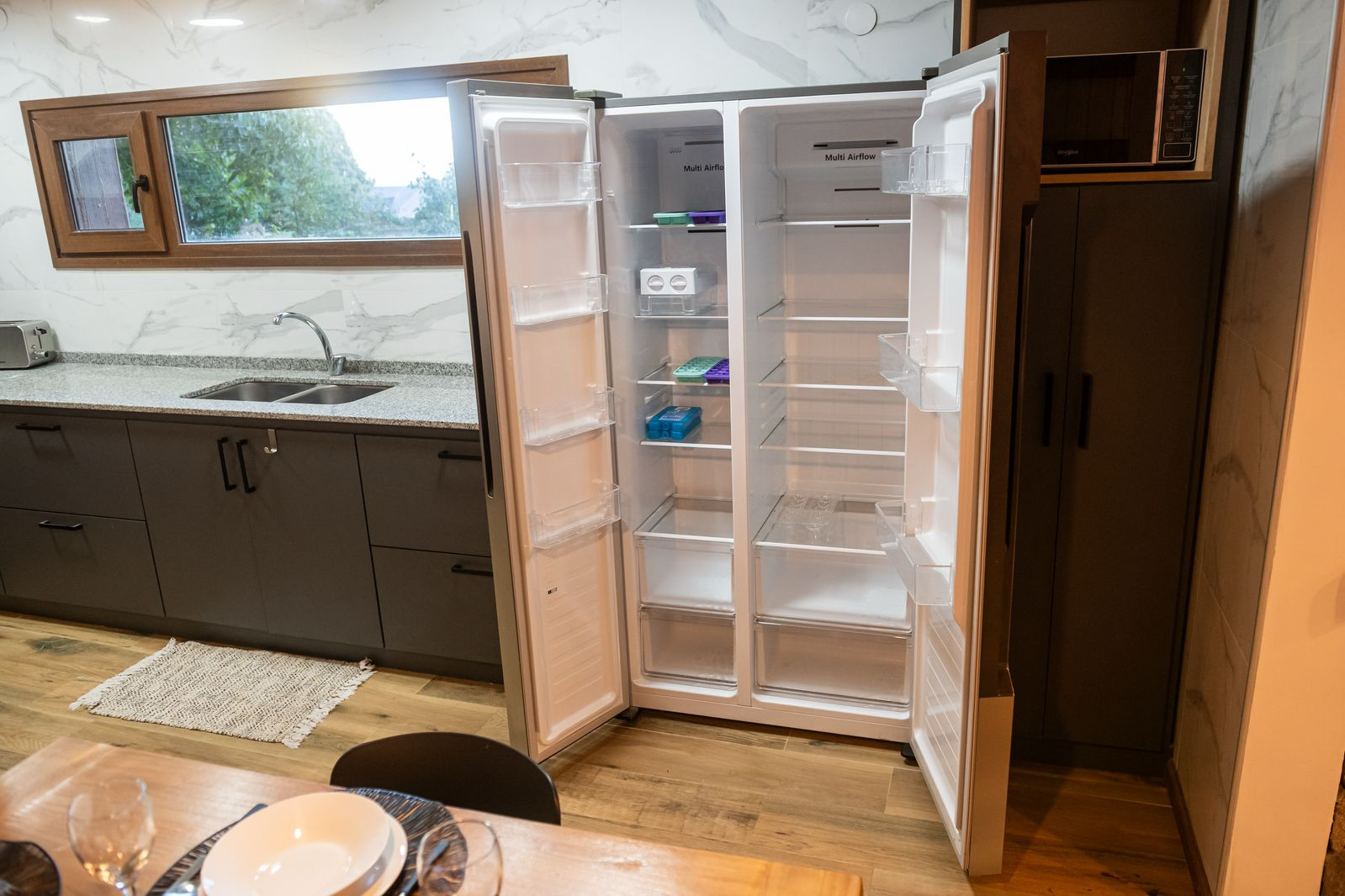 A cozinha americana está totalmente equipada com eletrodomésticos modernos, como geladeira, forno, micro-ondas e cafeteira.