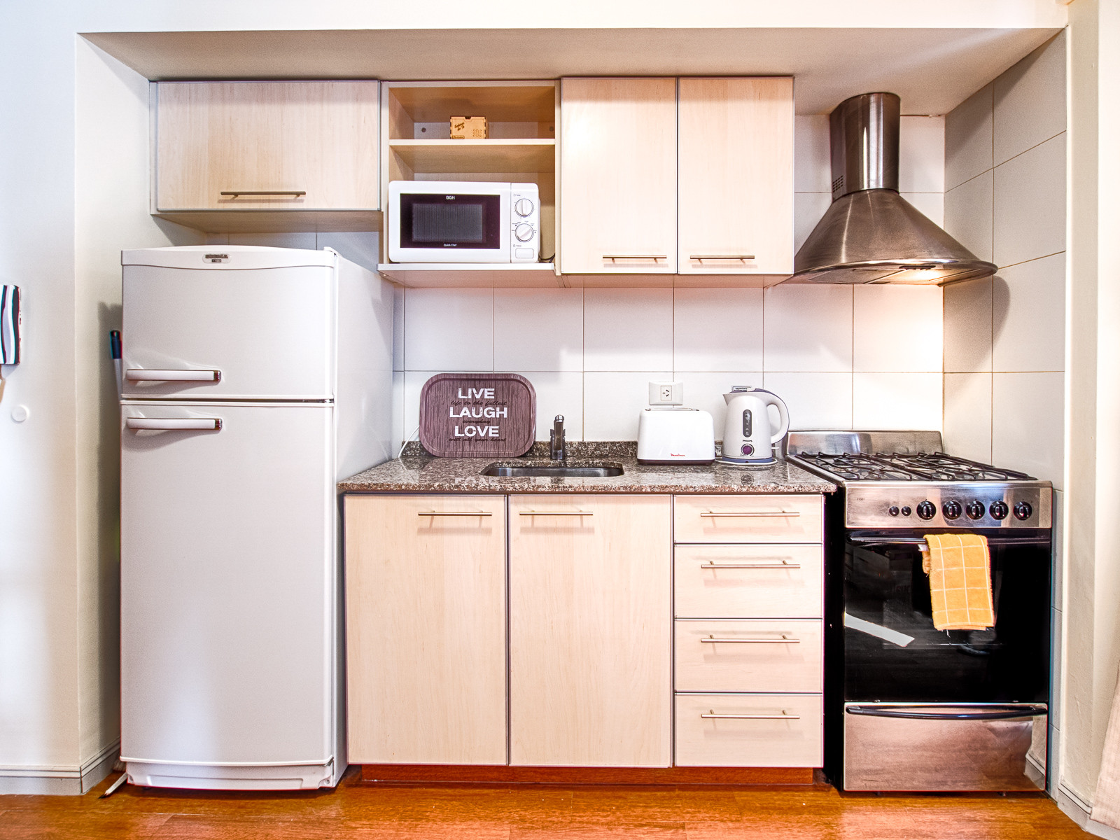 A cozinha americana, de gás, está equipada com geladeira, micro-ondas, forno, congelador, louça/talheres, utensílios/cozinha, cafeteira, torradeira, jarro elétrico e pratos e tigelas.