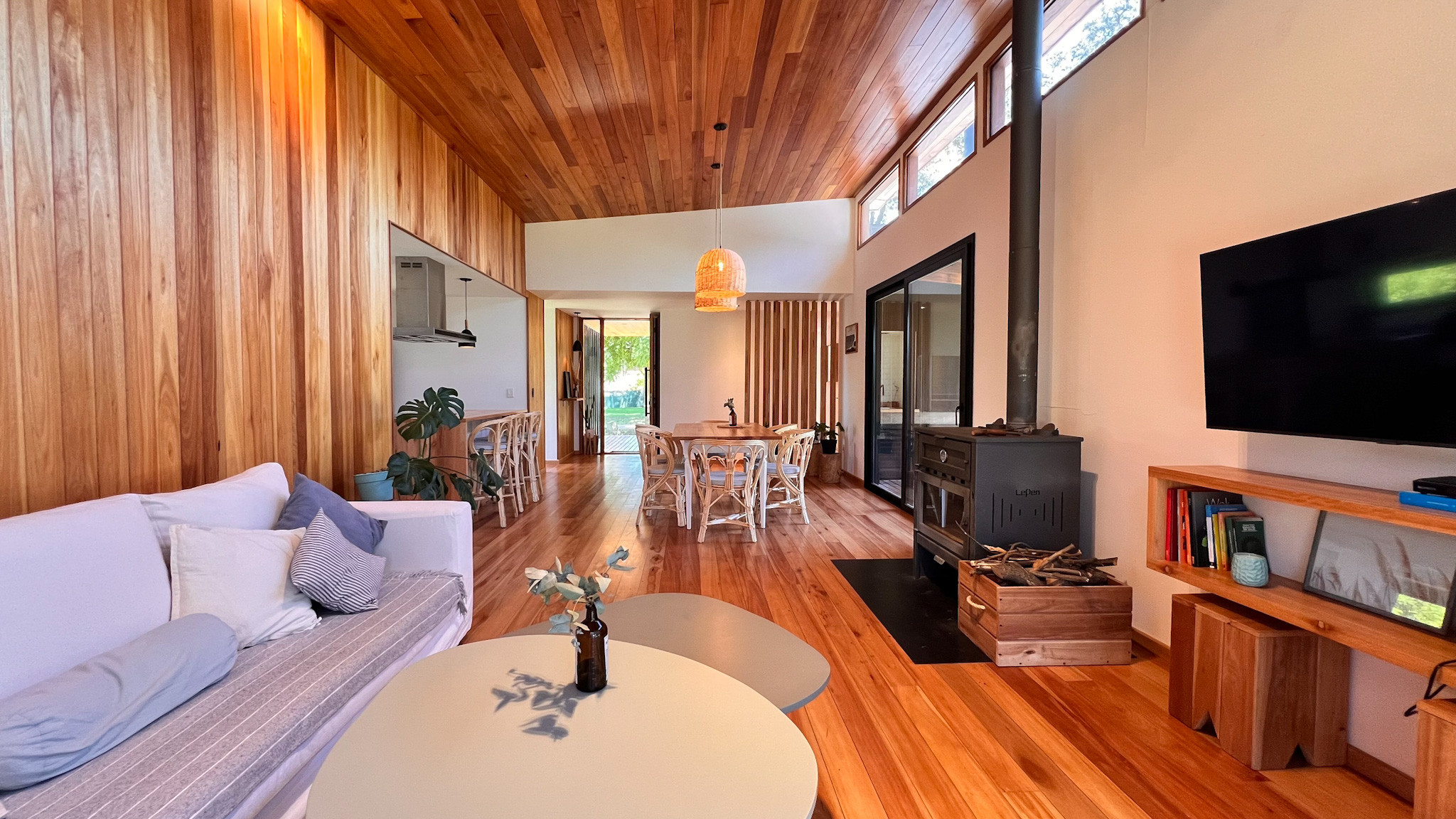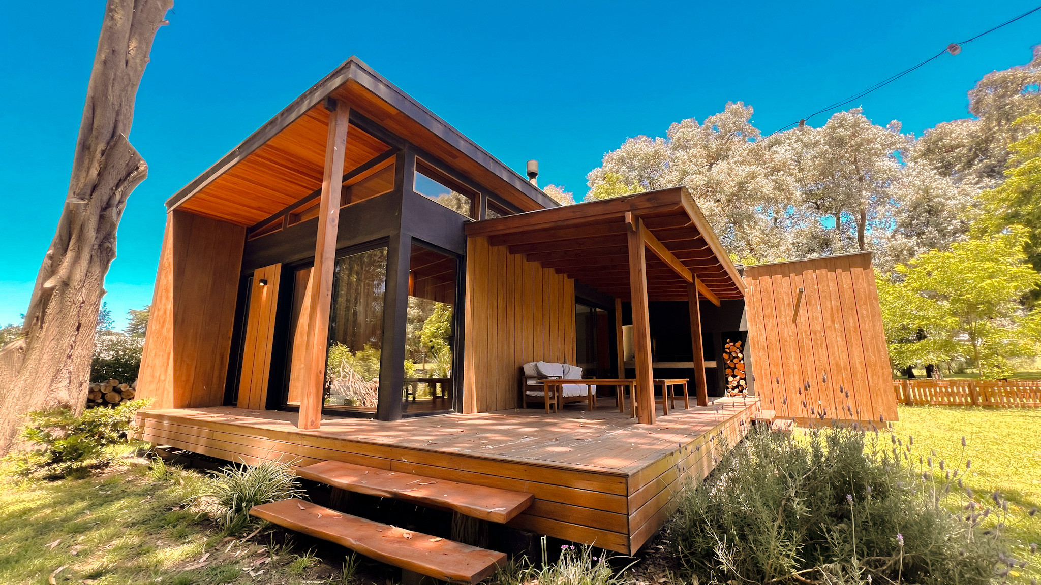 Casa Pancha nos invita a hacer la plancha y por sobre todas las cosas: descansar. Esta casa totalmente de madera está pensada para 4 personas y se ubica en el Barrio Cerrado Barrancas de San Benito. El barrio se encuentra a la altura de Lobos Chapadmalal y cuenta con seguridad 24 hs, amenities como canchas de tenis y fútbol para uso de los huéspedes, juegos para chicos y espacios abiertos y lleno de verde con unos atardeceres espectaculares que siempre recomendamos acercarnos al arroyo del barrio para verlo.