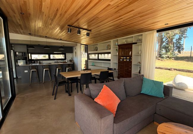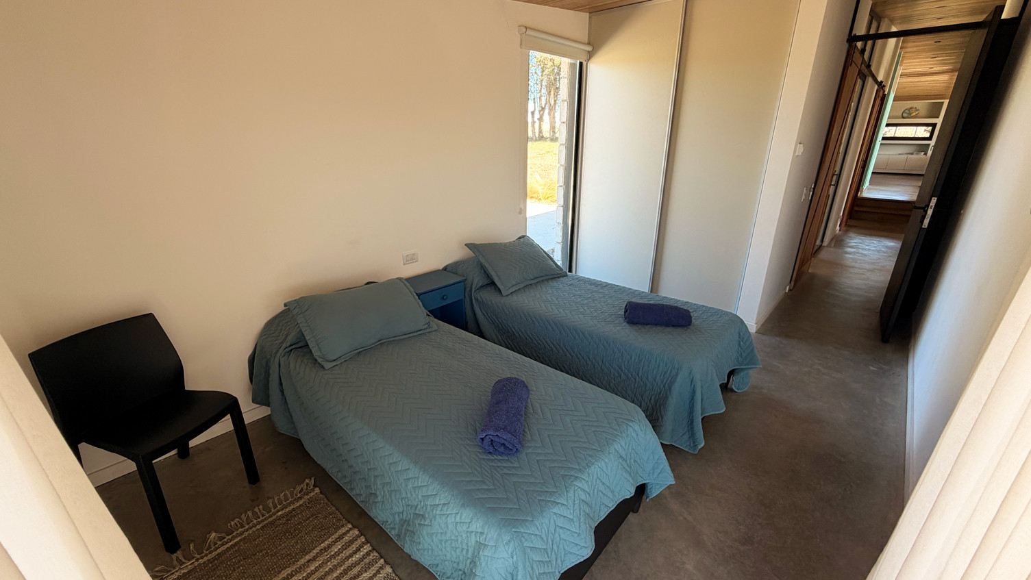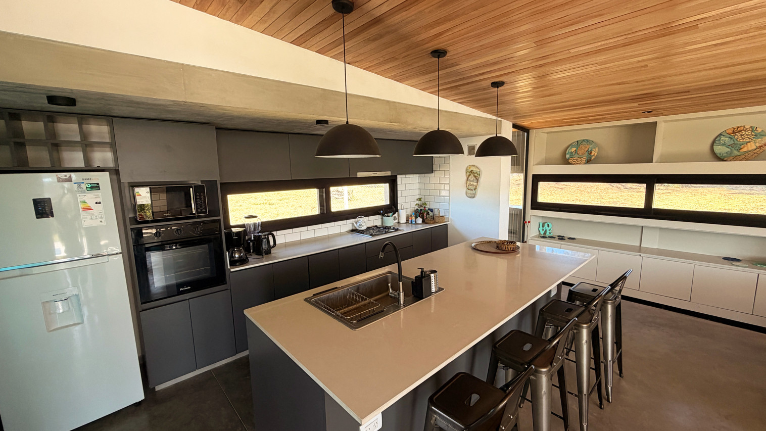 Nuestra Casa es ideal para amigos o familias ya que cuenta con 3 dormitorios pensado para 2 personas cada uno: el principal en suite con vestidor y salamandra en el mismo dormitorio (y no hablar de la vista espectacular al campo). El segundo dormitorio cuenta con 2 camas individuales y el tercero con cama estilo “cucheta”, más pequeño pero igual de cómodo y luminoso. Además, una cocina integrada con barra, comedor y living con smart TV y salamandra, y una galería techada con parrilla bien integrada a la casa.