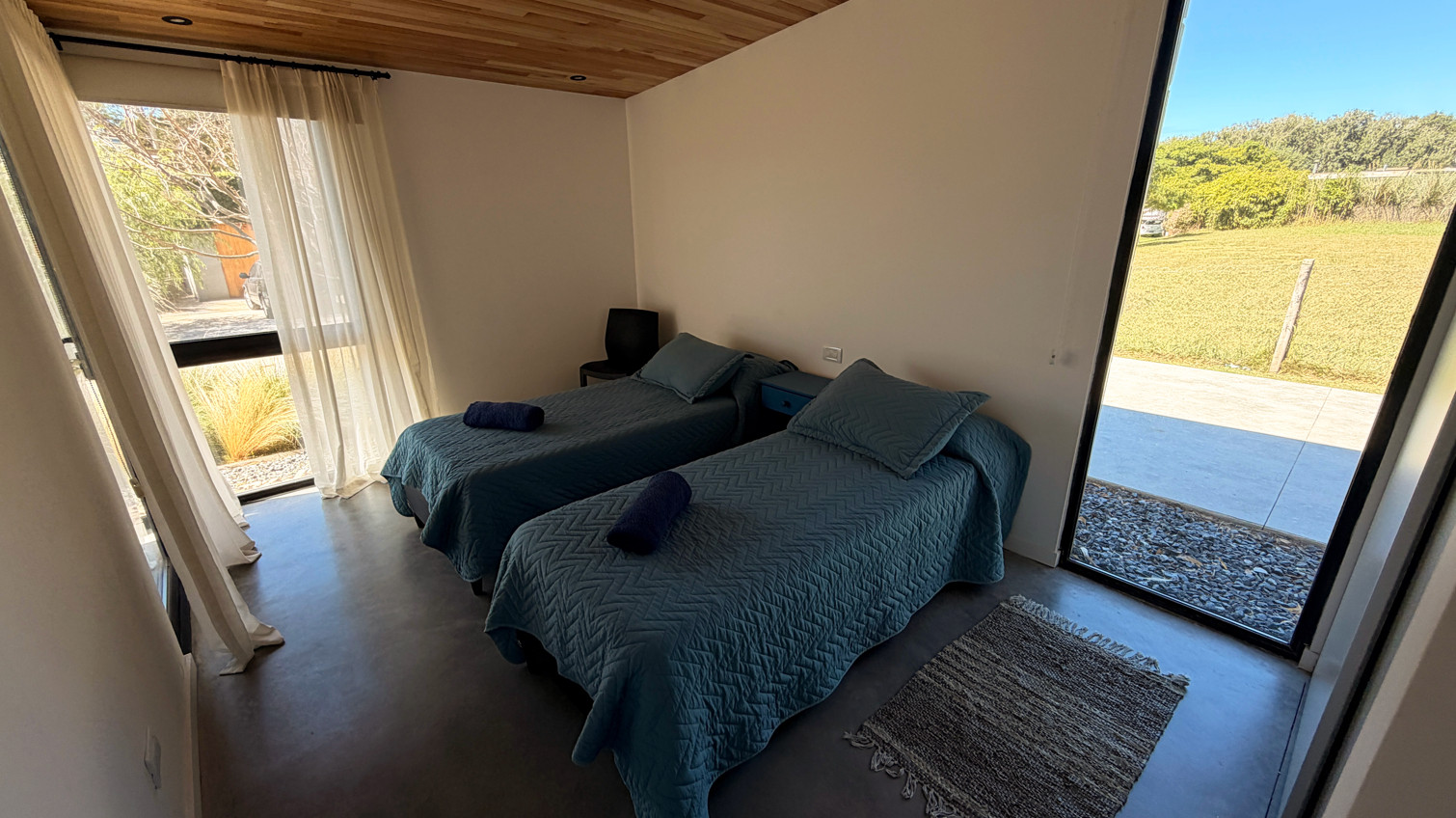 Cuentan con un interior cálido y funcional: una habitación principal con cama matrimonial, una segunda habitación con dos camas simples y un sofá cama en el living para dos personas. Para los días frescos, la casa tiene salamandra en el living y estufas eléctricas en las habitaciones, asegurando calidez y comodidad.