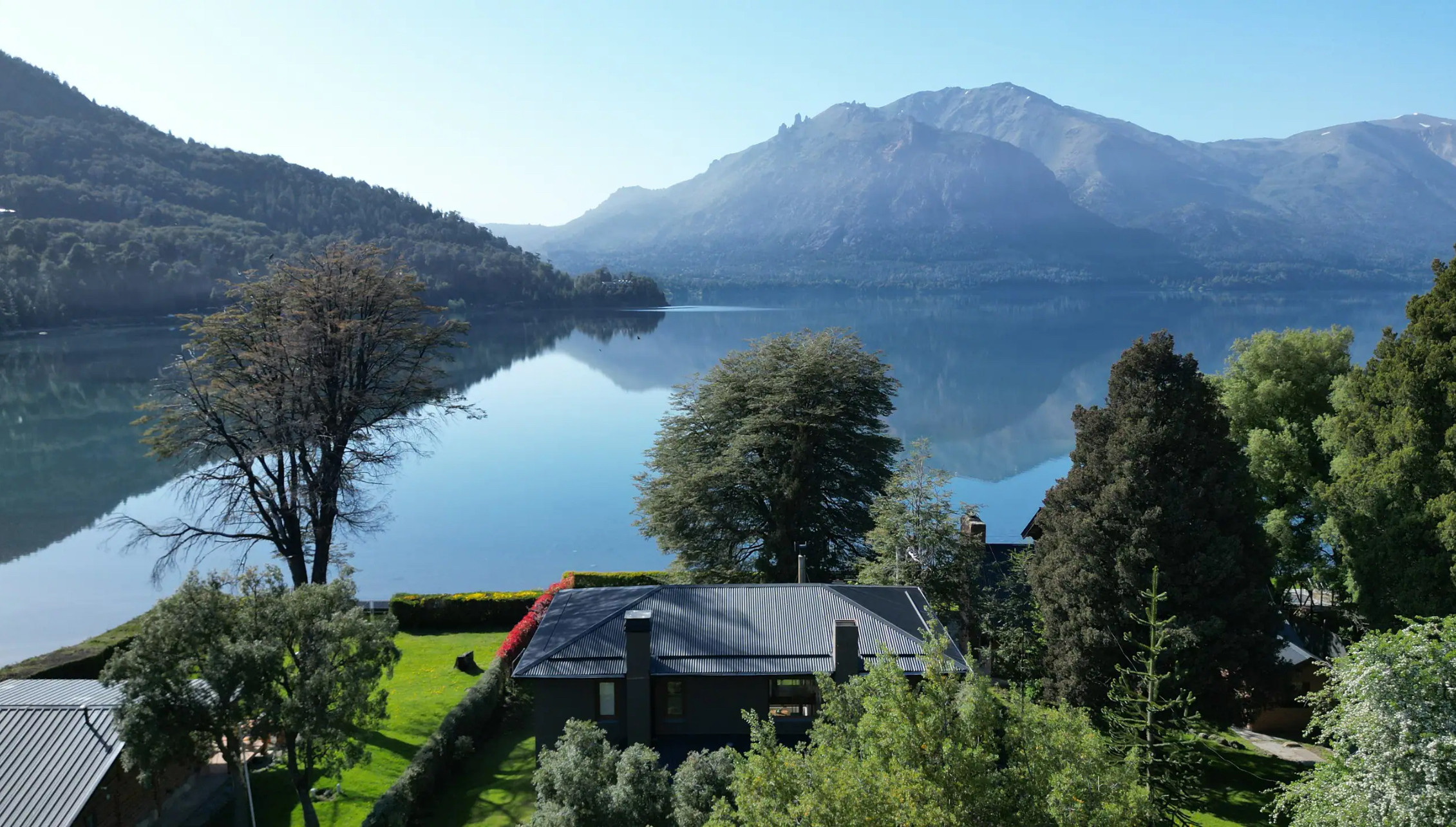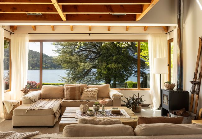 Hermosa casa sobre costa de lago e increíble vista a las montañas y al Lago Gutiérrez. Linda y cómoda, sin lujos.
