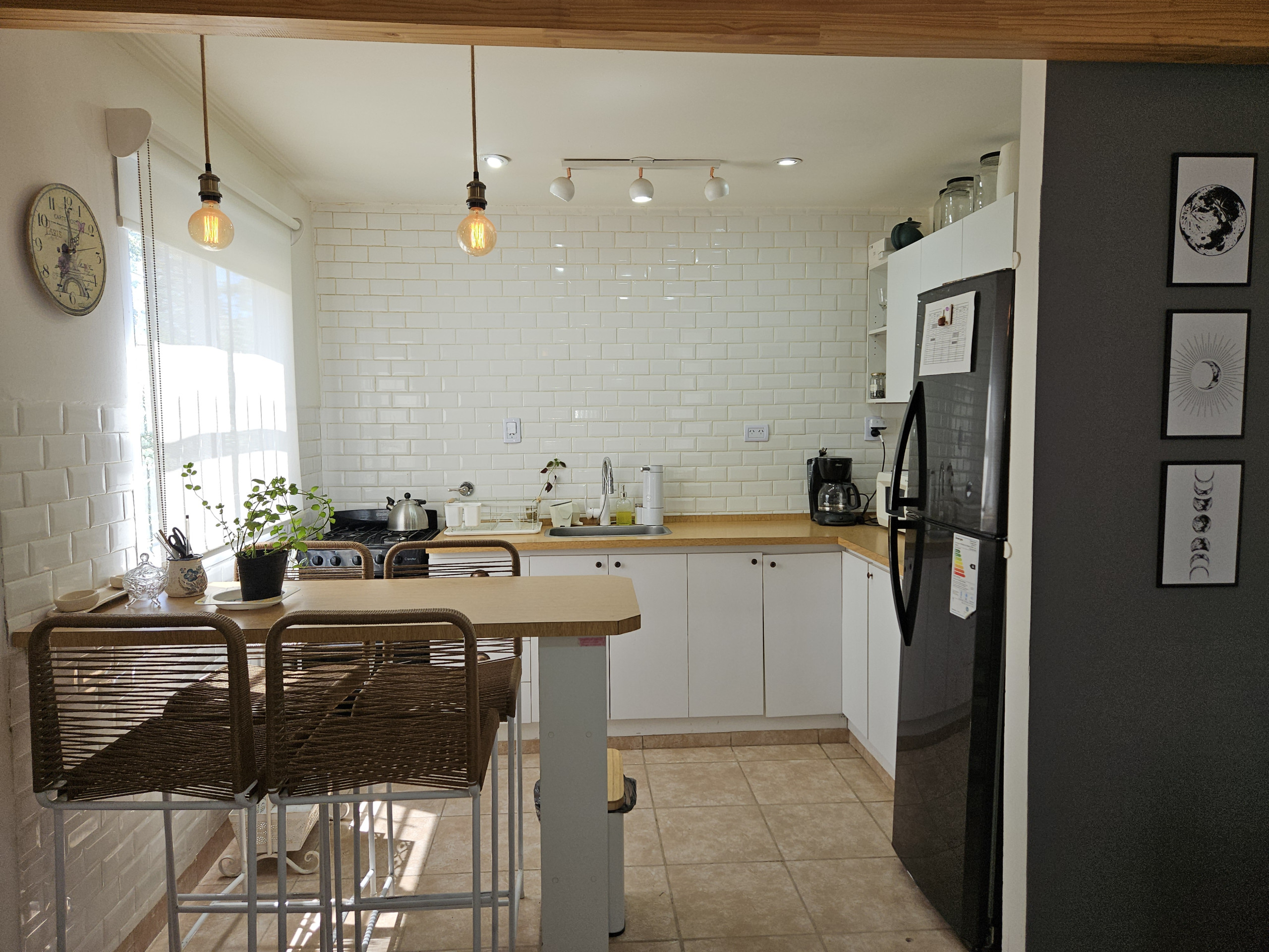 La cocina americana está totalmente equipada con electrodomésticos modernos, como nevera, horno, microondas y cafetera.