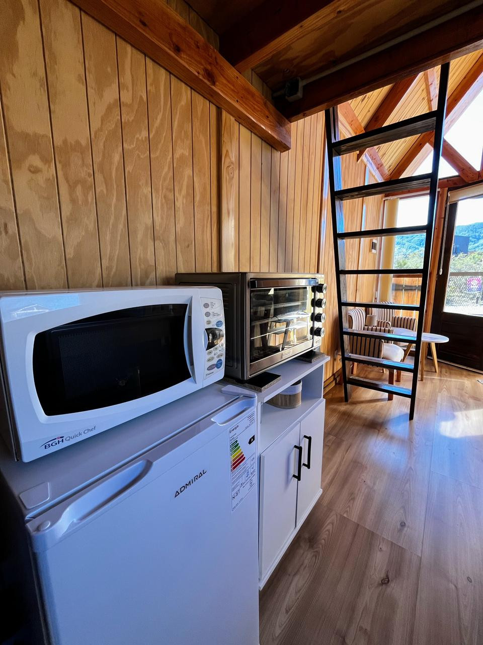 El espacio está diseñado para ofrecer comodidad y encanto en cada detalle. En la planta alta encontrarás una acogedora cama matrimonial, ideal para descansar y disfrutar del entorno. En la planta baja, la cocina totalmente equipada incluye horno eléctrico, microondas, pava eléctrica y tostadora, perfecta para preparar tus comidas favoritas.