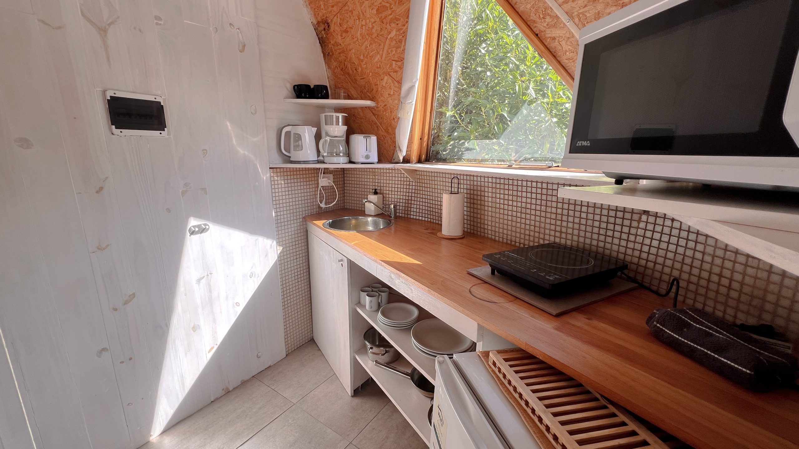 Each dome is a loft that comfortably accommodates 2 people with the possibility of an extra (boy or girl) in a mezzanine within each unit. Depending on the unit, beds can be adapted to be a double bed or single beds, ask us according to your needs. Additionally, a small well-equipped kitchen will solve all your meals during your stay, and the living-dining area allows you to have breakfast or enjoy a glass of wine with a warm temperature inside the dome in case you do not want to be on the deck. Each deck has loungers and space to privately enjoy your rest.