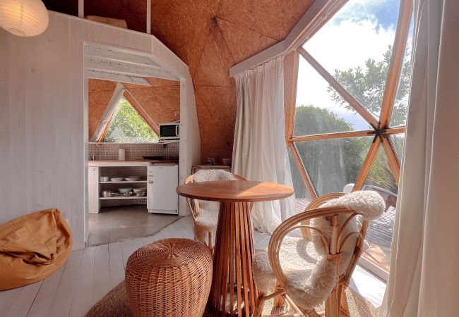Each dome is a loft that comfortably accommodates 2 people with the possibility of an extra (boy or girl) in a mezzanine within each unit. The beds, depending on the unit, can be adapted to be a double bed or single beds, ask us according to your needs. Additionally, a small well-equipped kitchen will solve all your meals during your stay, and the living-dining area allows you to have breakfast or enjoy a glass of wine with a warm temperature inside the dome in case you don't want to be on the deck. Each deck has loungers and space to privately enjoy your rest.