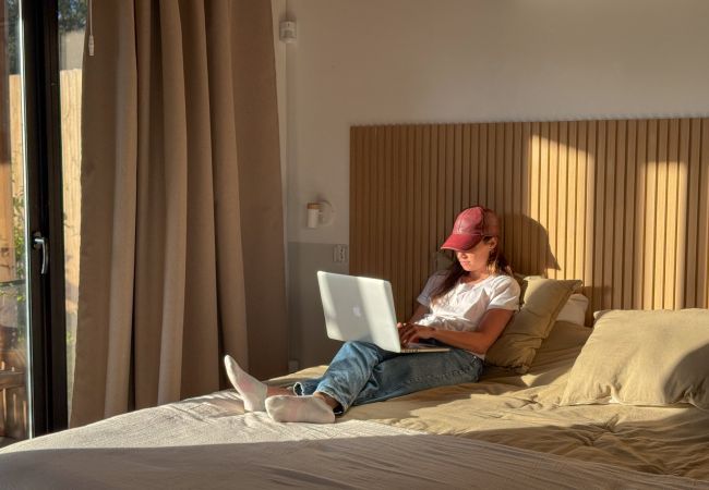 Designed for each house to accommodate up to 4 people, each house has an independent entrance, 1 bedroom with a double bed, a bathroom, and a living-dining room with an integrated kitchen. In the living room, you will have a sofa bed and blackout curtains to ensure a good rest for the 2 guests sleeping there. Each house has a private garden with a gallery, grill, fire pit, and garden with solarium. Additionally, each house has air conditioning for cold and heat and mosquito nets.