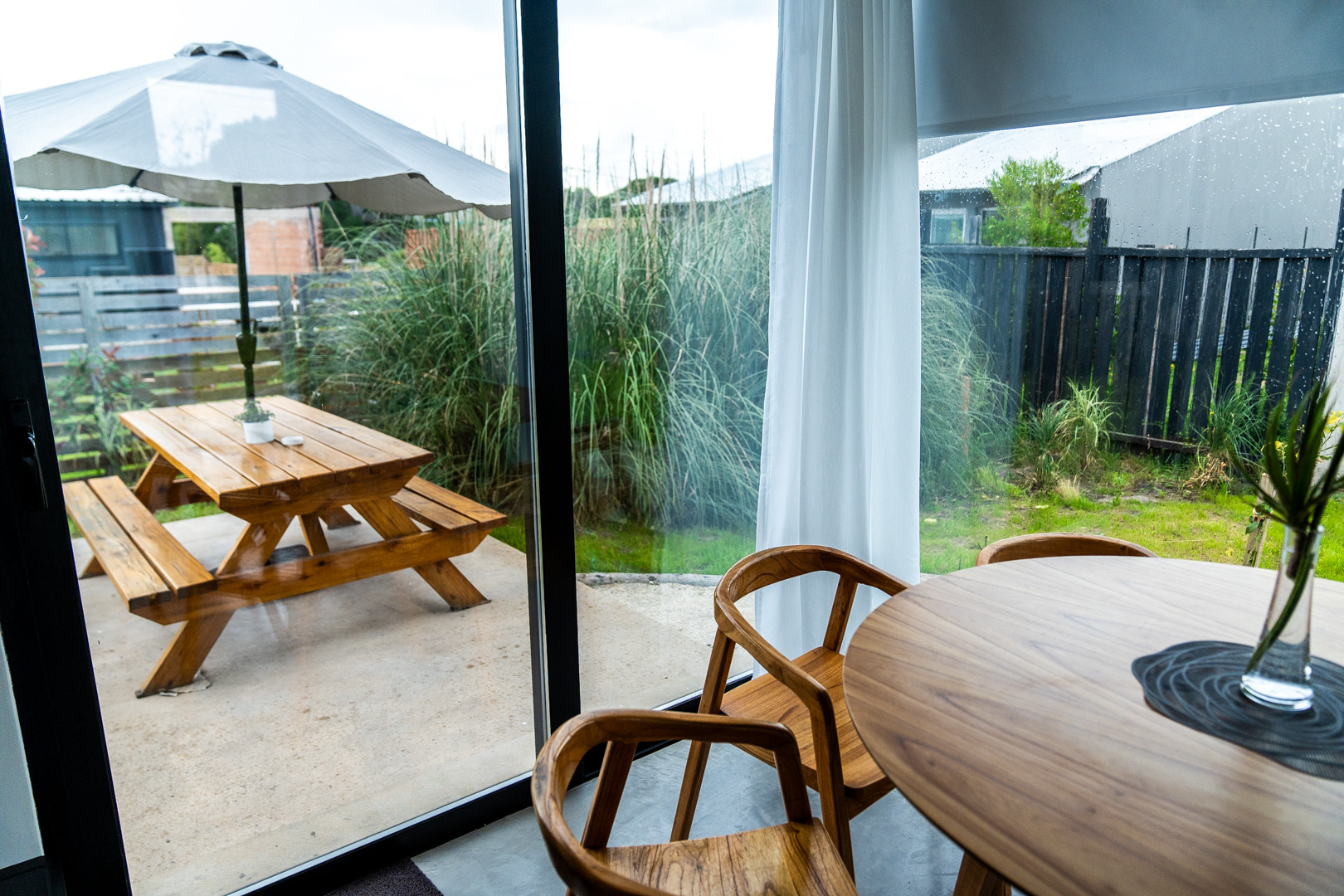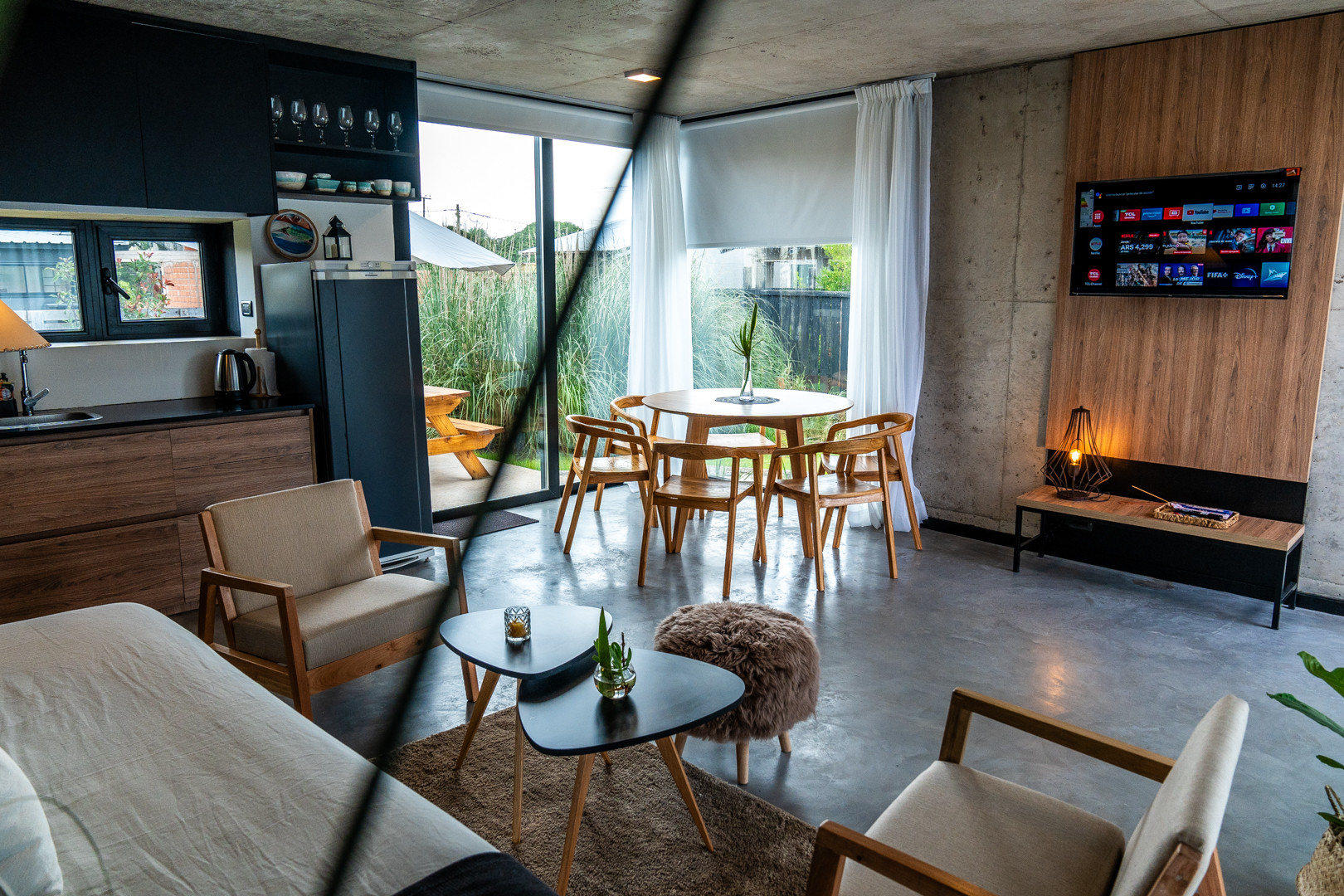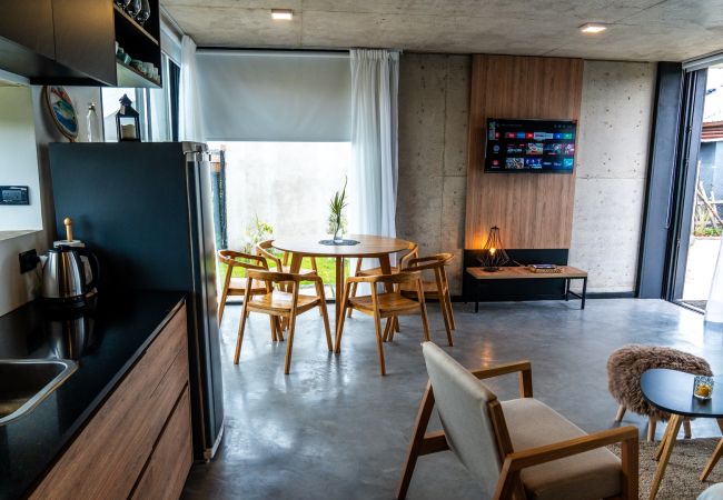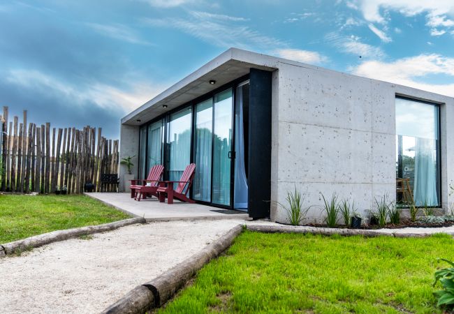 Each house has a living-dining room with an integrated kitchen. In the same space, there is a sailor-style sofa bed with very comfortable mattresses and blackout curtains. A main bathroom and a bedroom, all brand new. Outside, you will have a churrasco-style grill, a dining table with an umbrella, and an outdoor living area in the front of the house to enjoy all day. Additionally, with an open space to park your car, we couldn't ask for more!