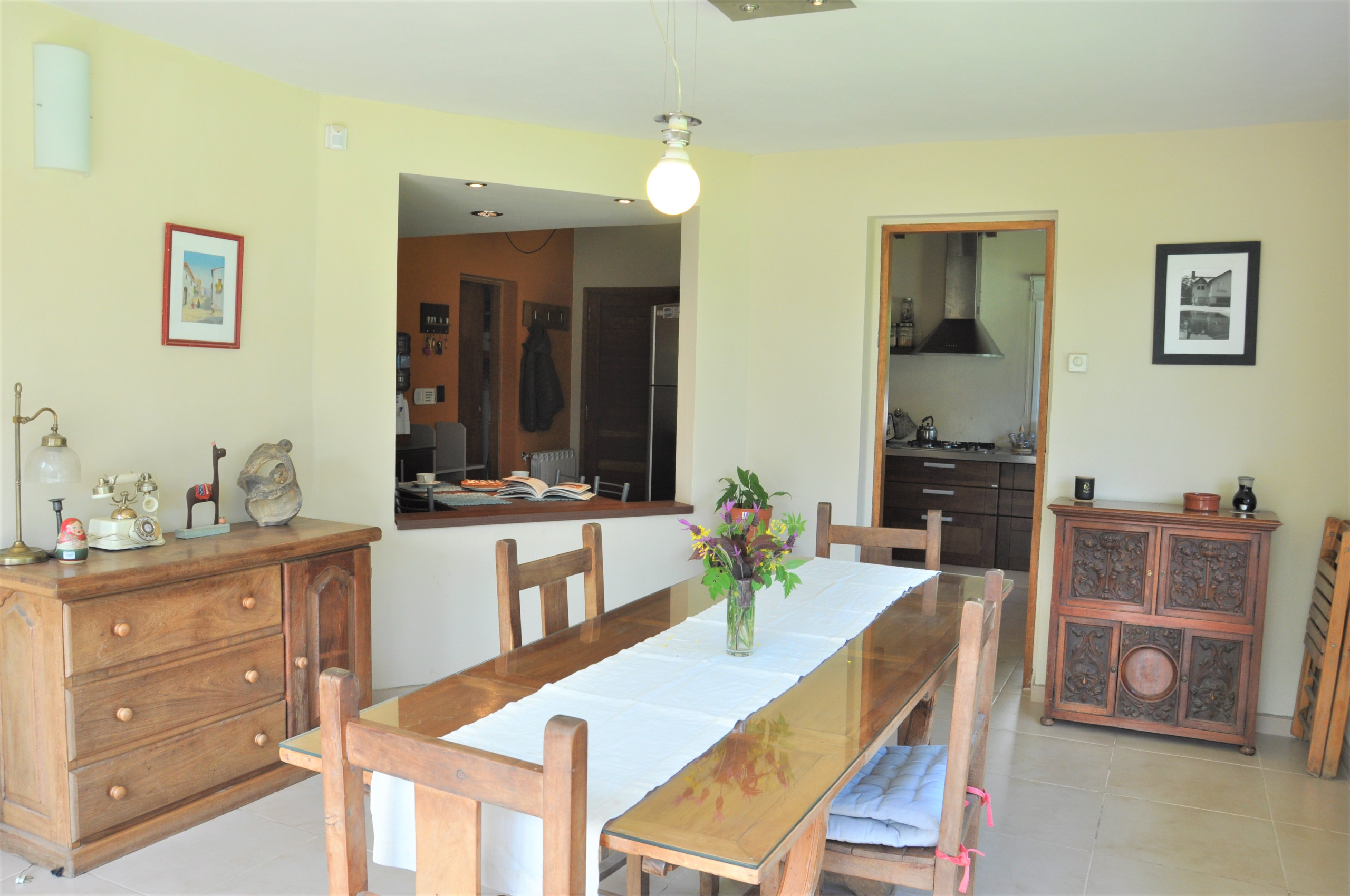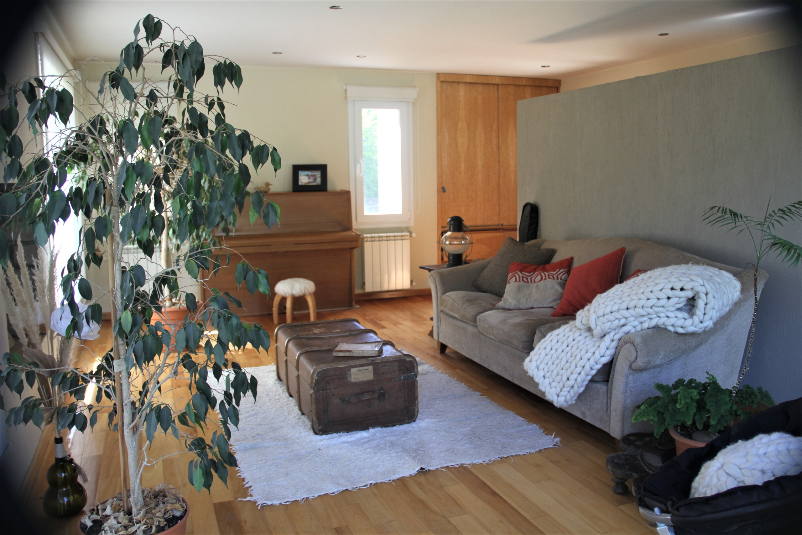 The house has a spacious living room equipped with games, a chalkboard, and a foosball table, ideal for entertainment and relaxation moments.