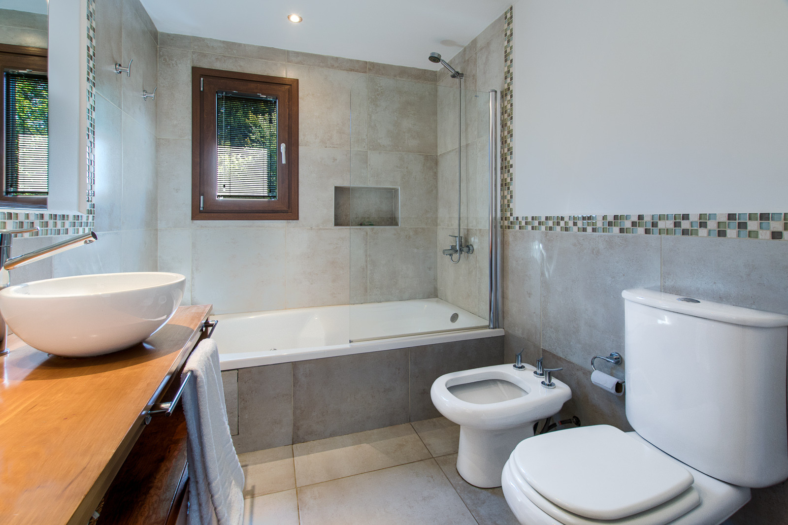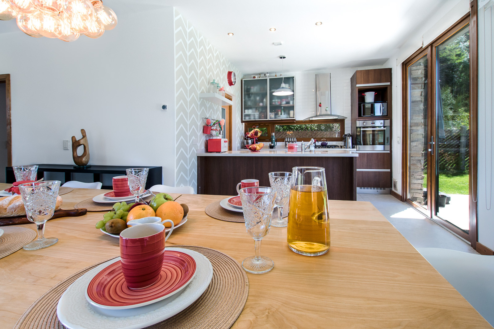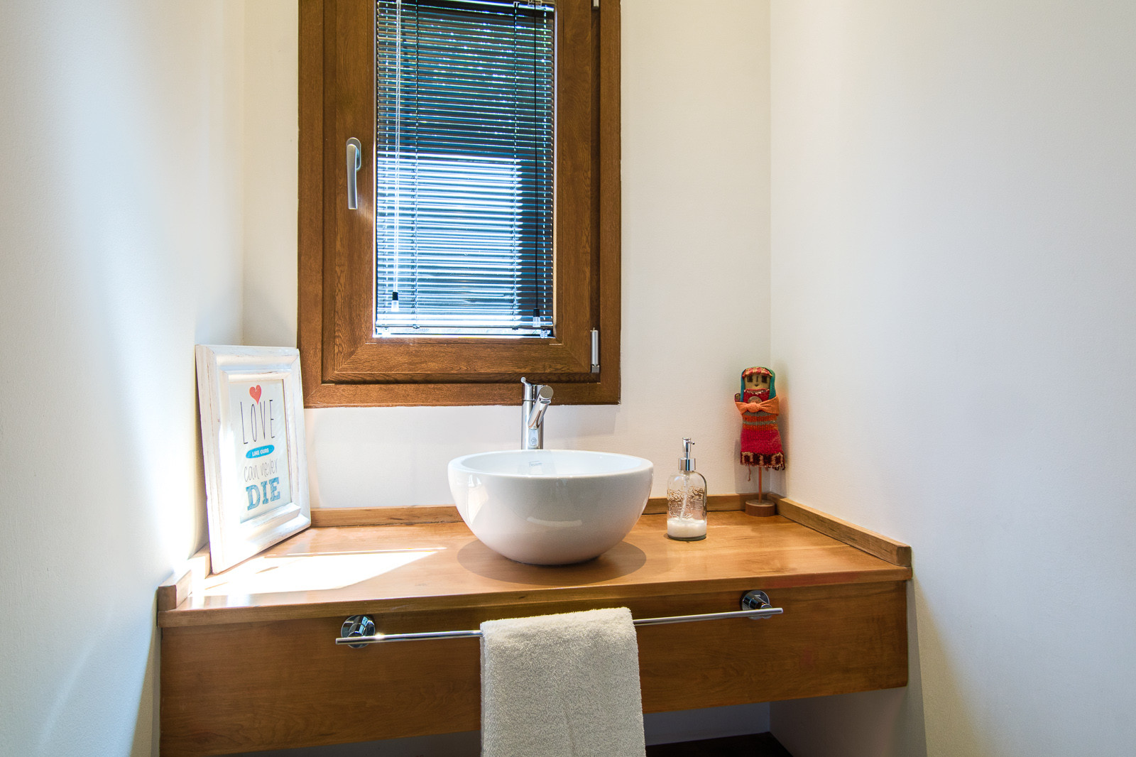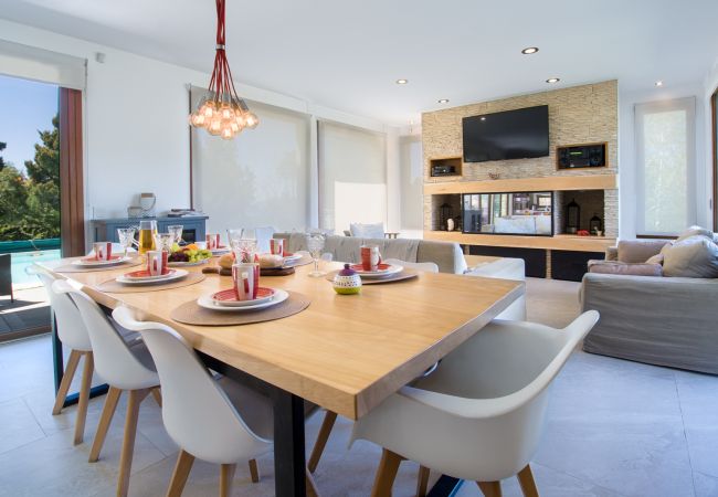 "Family Home is an ideal house for families, featuring 4 bedrooms: one with a double bed, one with a trundle bed, one with bunk beds, and one on the ground floor with a daybed (a bed with a pull-out trundle). It includes 2 full bathrooms, a half-bath, a fully equipped kitchen with a laundry area, washing machine, and dryer. The living and dining area has a grill concealed behind a mirror, which is really practical. The garden is perfect for enjoyment with a heated pool and children's play equipment."