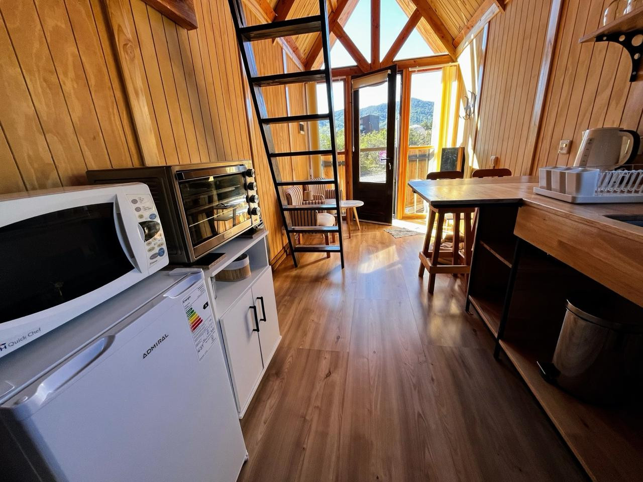 The space is designed to offer comfort and charm in every detail. On the upper floor, you will find a cozy double bed, ideal for resting and enjoying the surroundings. On the ground floor, the fully equipped kitchen includes an electric oven, microwave, electric kettle, and toaster, perfect for preparing your favorite meals.