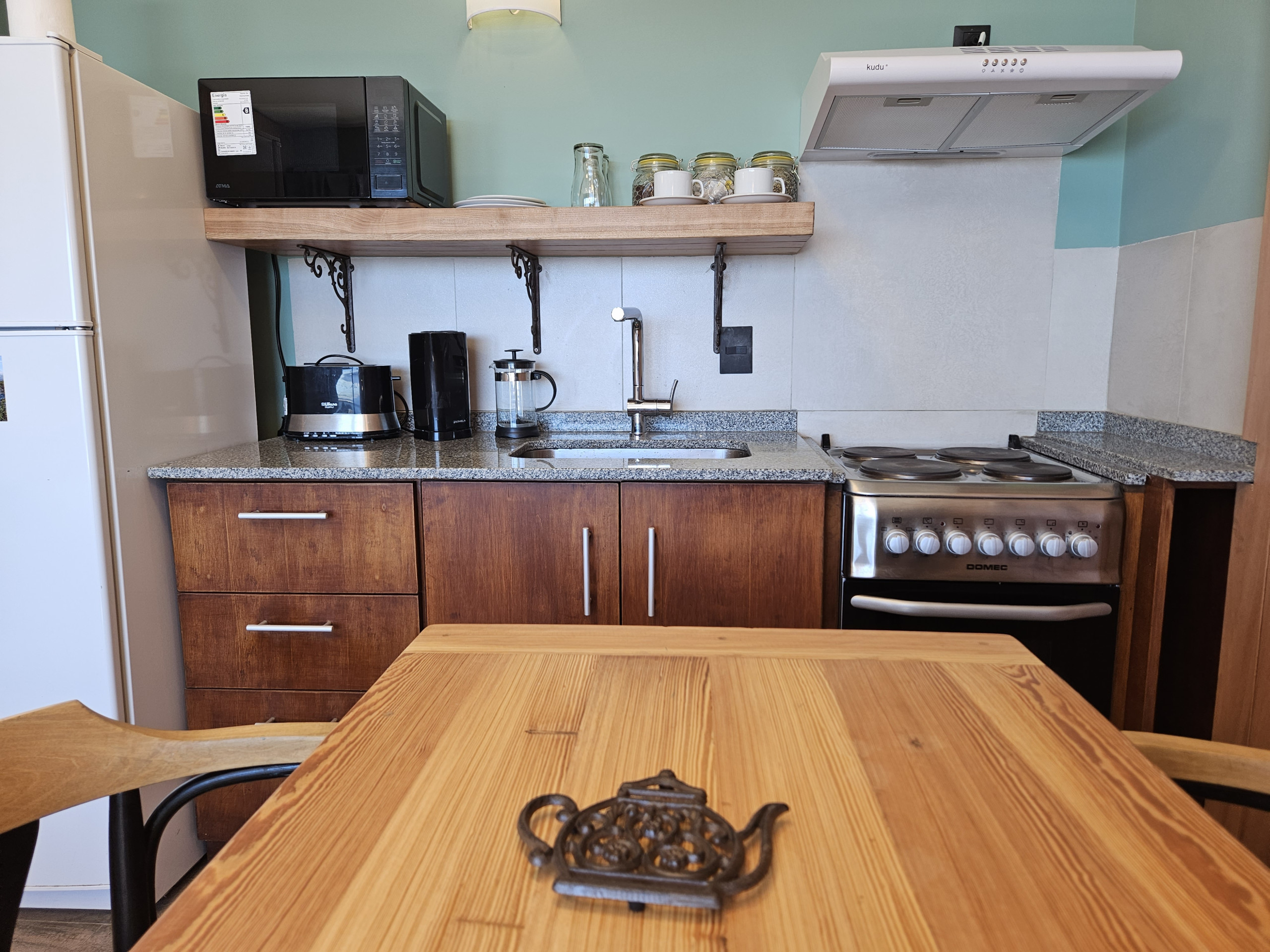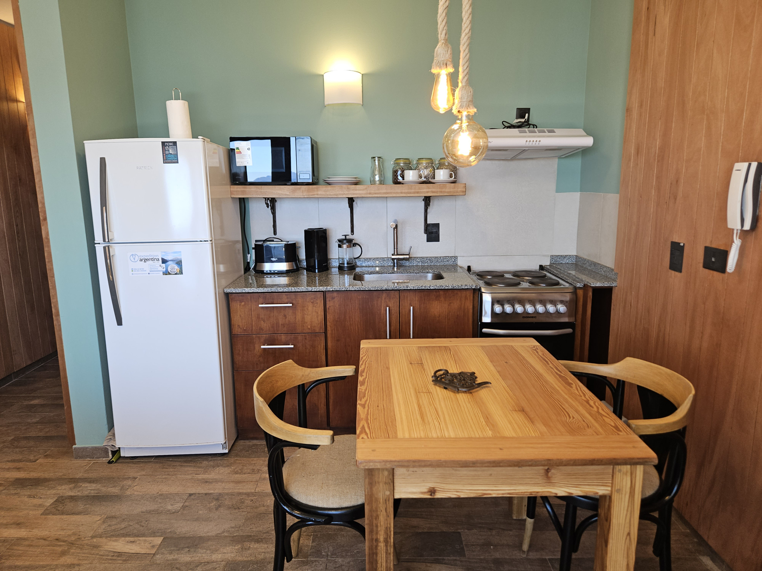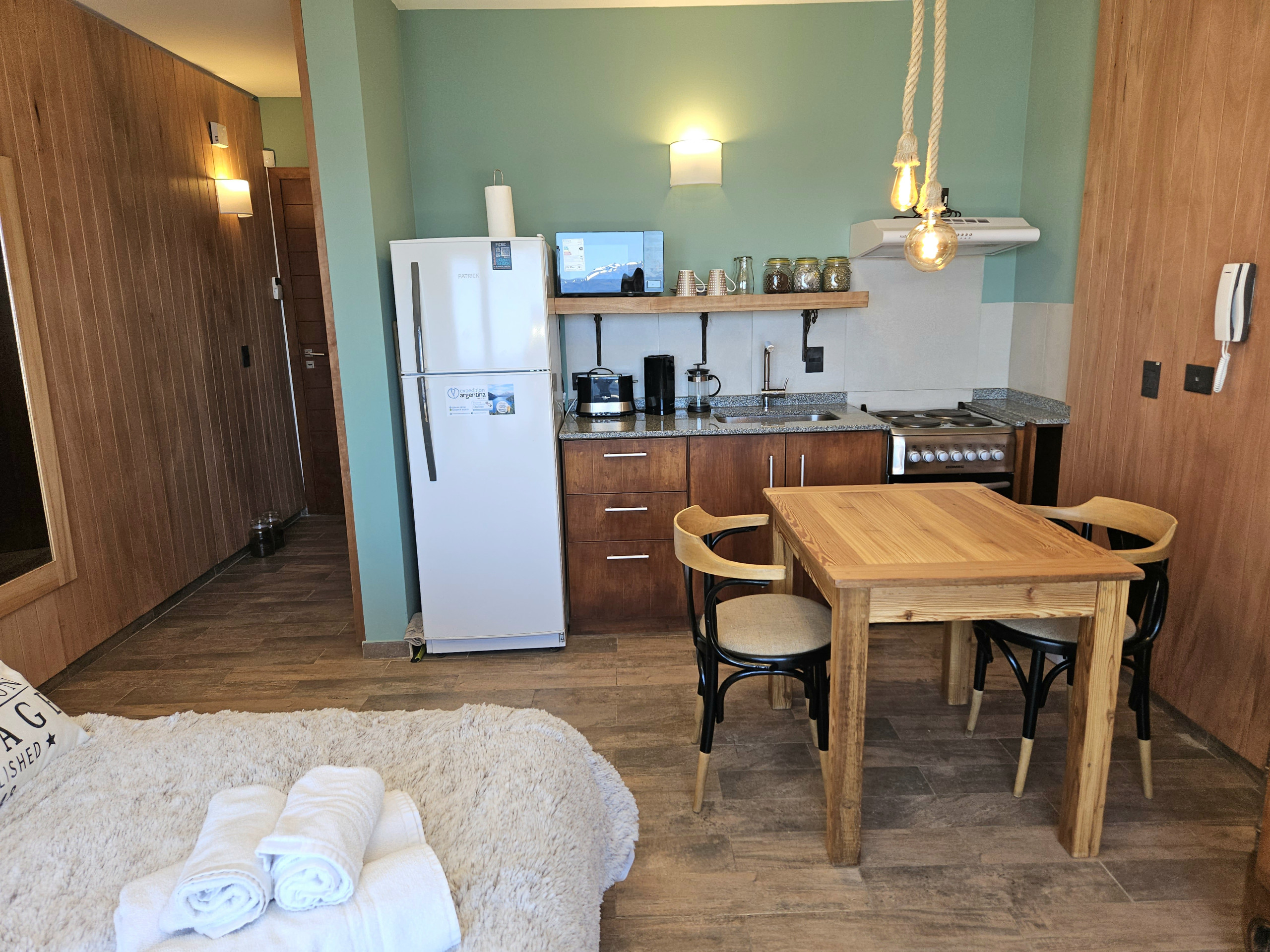 The apartment is a very bright studio with beautiful views of Nahuel Huapi. It has a double bed, a fully equipped kitchen, a microwave, a toaster, an electric kettle, an electric stove, and all the necessary utensils for cooking, as well as a full bathroom with a bathtub. The heating in the apartment is provided by gas heaters.